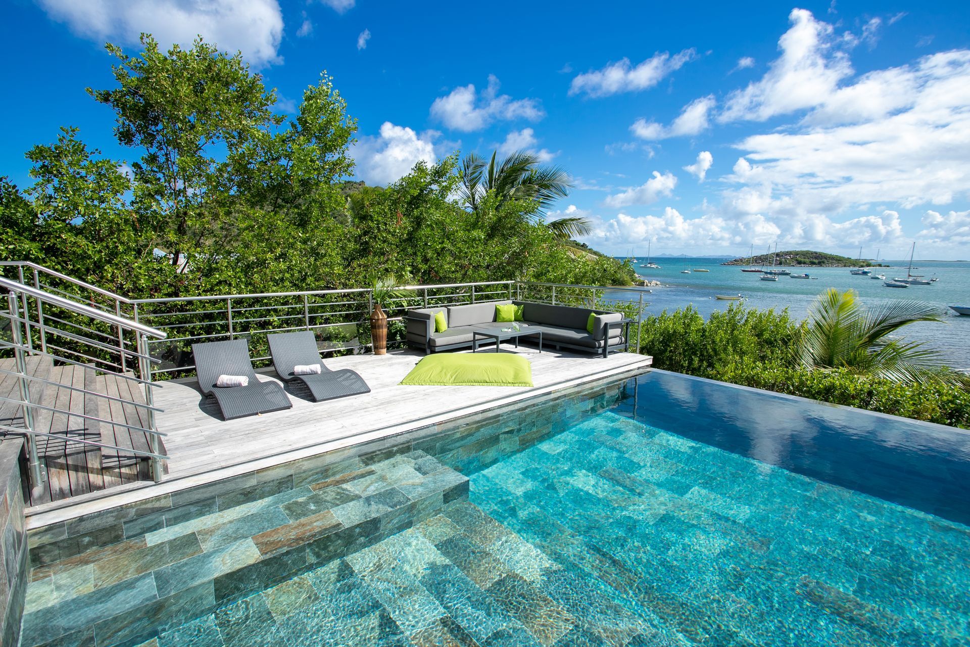 It opens directly to the sun deck with a great view of the Caribbean Sea, Pinel Island and Orient Bay.